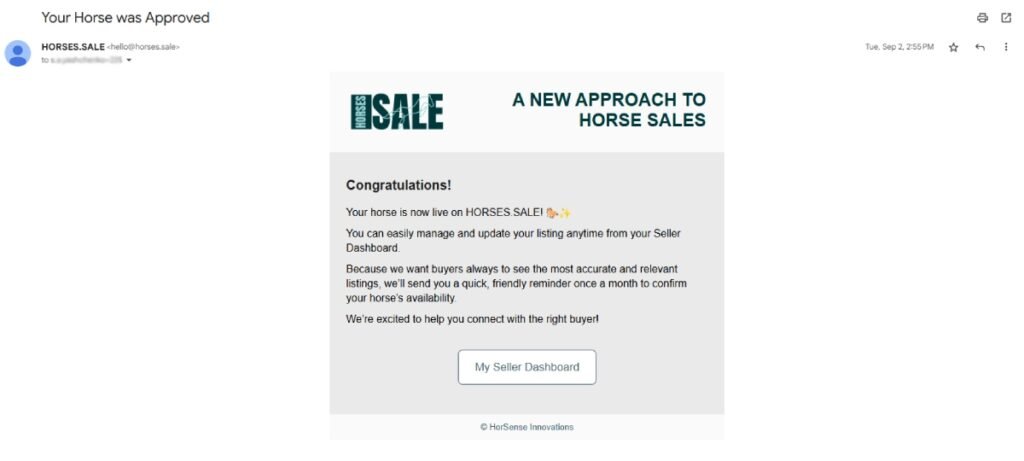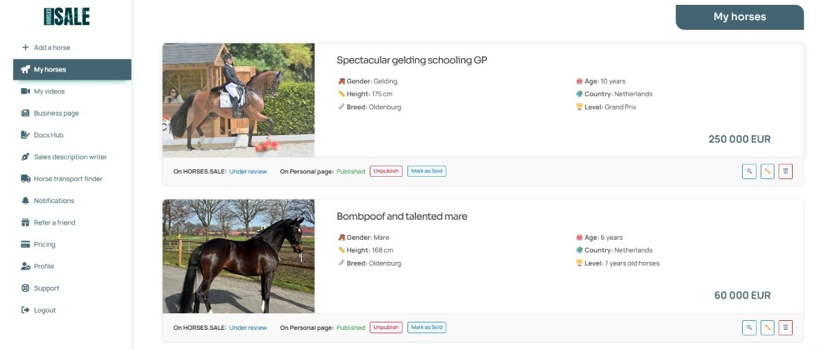 Step 6. If your horse was submitted for inclusion in the HORSES.SALE database, its initial status will appear as “Under review.” Once our team approves the listing, the status will change to “Published,” and you will receive a confirmation email.
