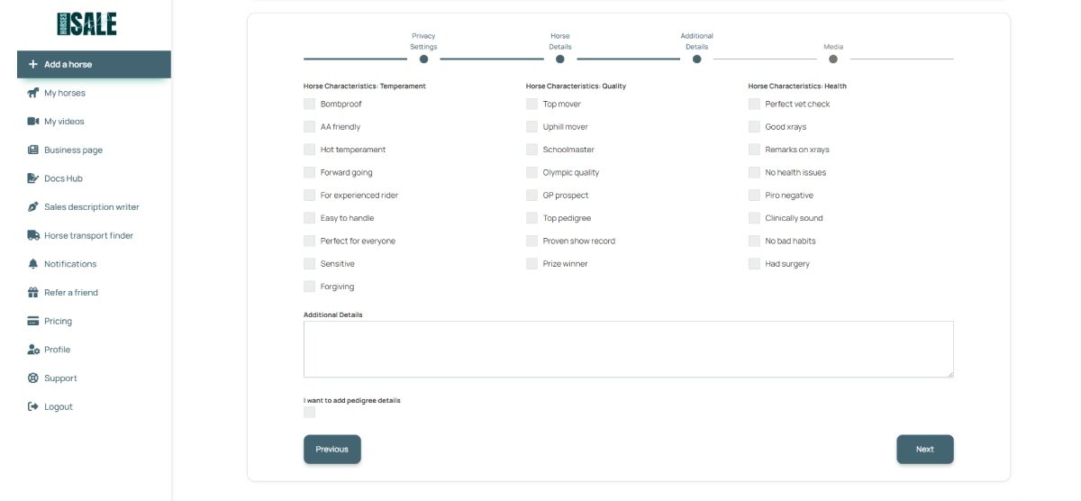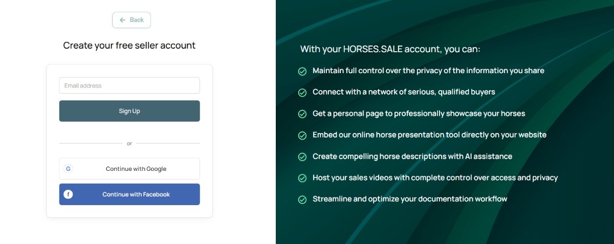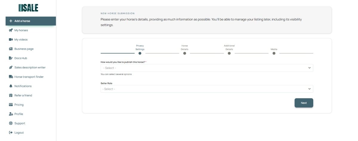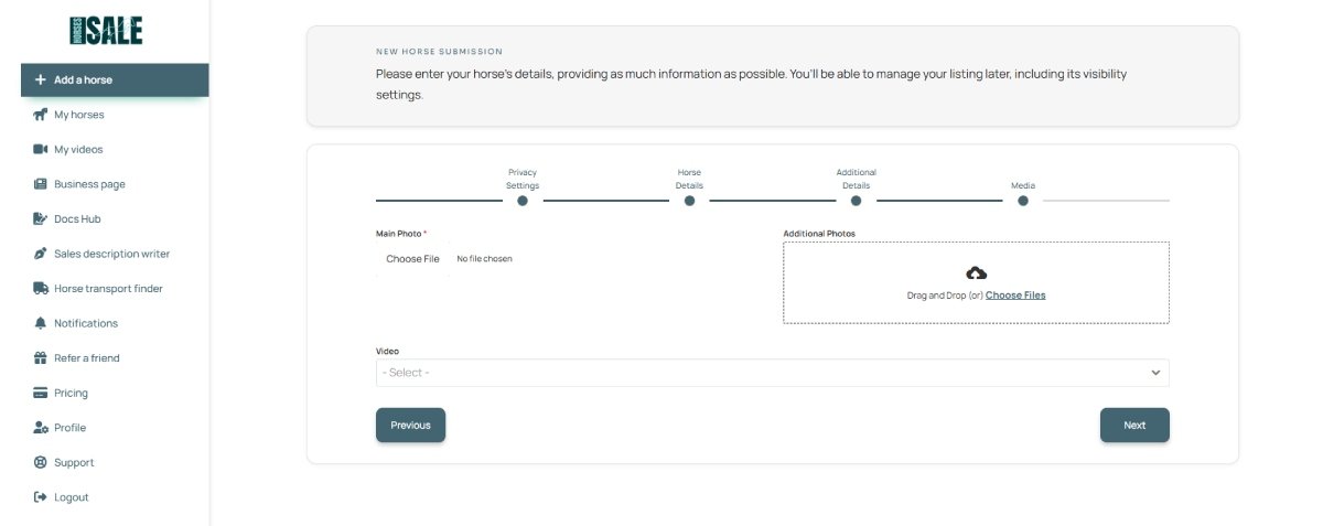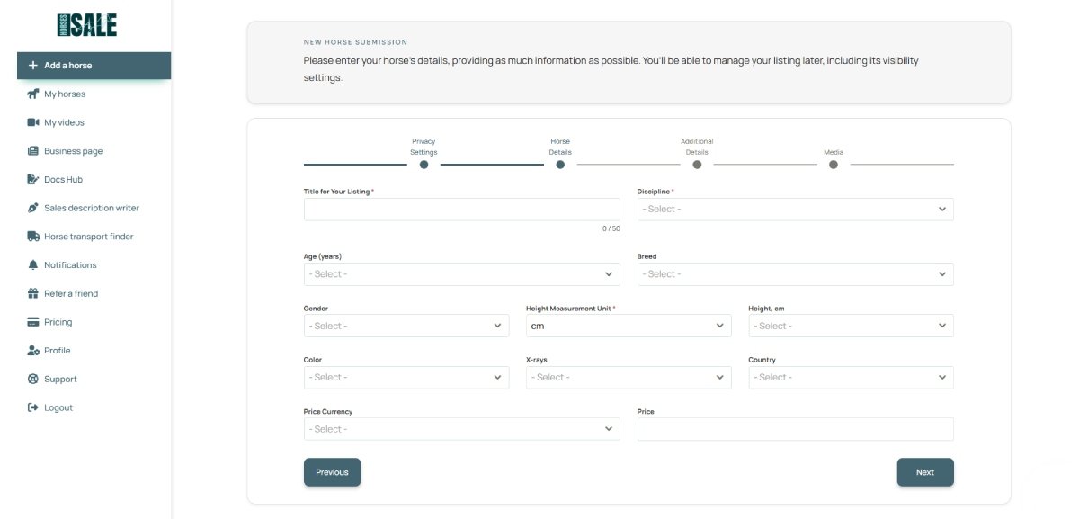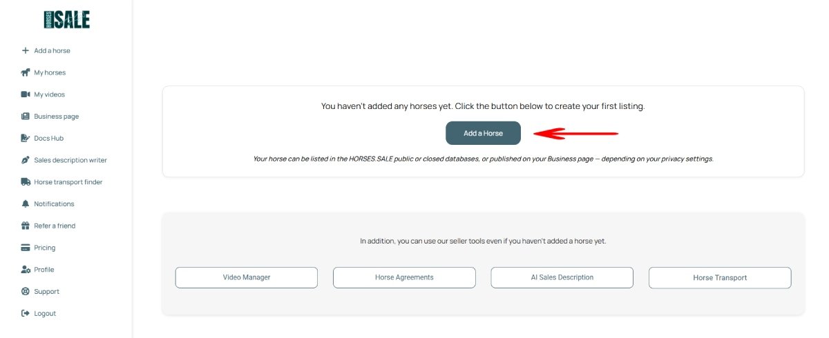 Whether you want to list your horse for sale through HORSES.SALE or simply use the Personal Page feature, the first step is always to create a horse listing.