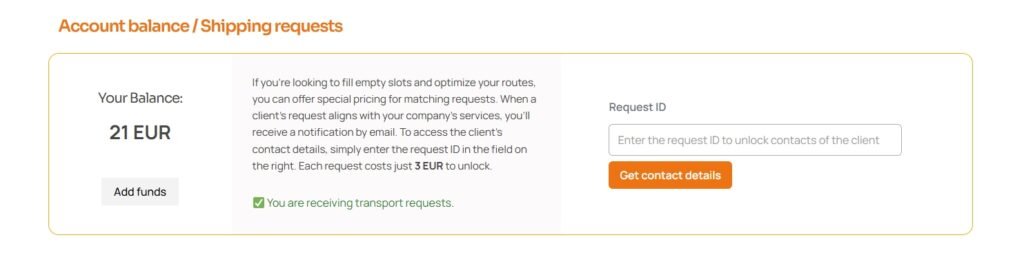 If the User Requests feature is activated for your account, you will receive notifications about transport requests that match your business profile. Each email notification includes a Request ID. If you are interested in a particular request and wish to make an offer, enter the Request ID in your dashboard to view the client’s contact details. You can then discuss transportation details directly with the client if they confirm their interest.